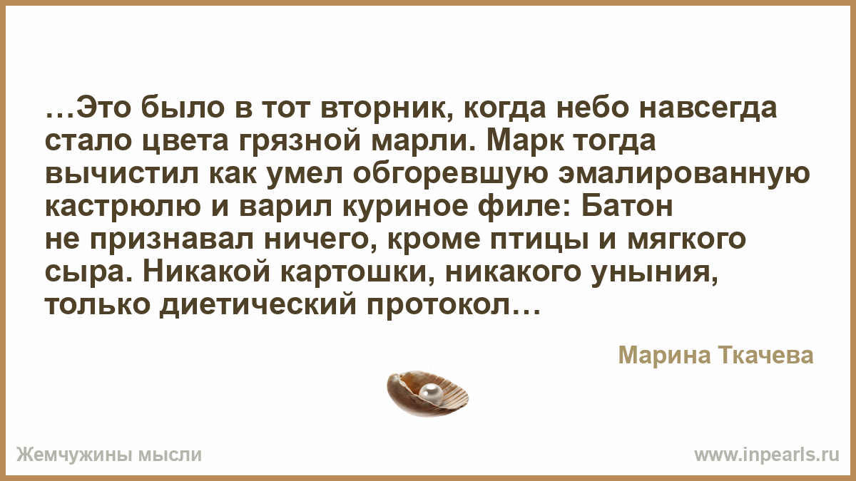 …Это было в тот вторник, когда небо навсегда стало цвета грязной марли. Марк тогда вычистил как умел обгоревшую эмалированную кастрюлю и варил куриное филе: Батон не признавал ничего, кроме птицы и мягкого сыра. Никакой картошки, никакого уныния, только диетический протокол.