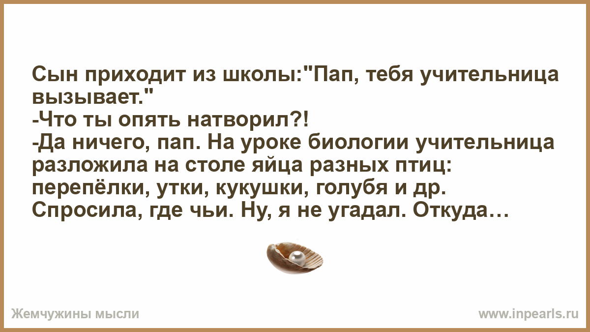 -Да ничего, пап. На уроке биологии учительница разложила на столе яйца разных птиц: перепёлки, утки, кукушки, голубя и др. Спросила, где чьи. Ну, я не угадал. Откуда я знаю? Велела тебе прийти.