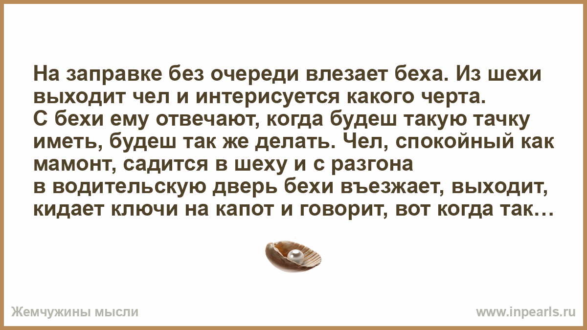 На заправке без очереди влезает беха. Из шехи выходит чел и интерисуется какого черта. С бехи ему отвечают, когда будеш такую тачку иметь, будеш так же делать. Чел, спокойный как мамонт, садится в шеху и с разгона в водительскую дверь бехи въезжает, выходит, кидает ключи на капот и говорит, вот когда так тачки будеш менять, тогда и быковать будеш, и спокойно уходит. Шоха оказалась в угоне, реальный случай, Томск 90е.