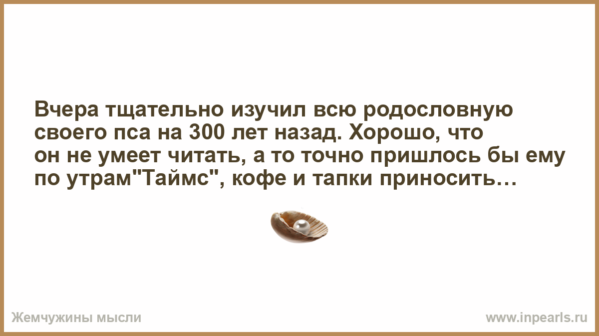 Вчера тщательно изучил всю родословную своего пса на 300 лет назад. Хорошо, что он не умеет читать, а то точно пришлось бы ему по утрам"Таймс", кофе и тапки приносить…