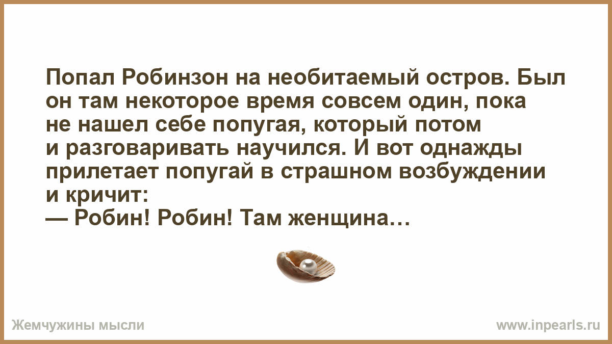 Попал Робинзон на необитаемый остров. Был он там некоторое время совсем один, пока не нашел себе попугая, который потом и разговаривать научился. И вот однажды прилетает попугай в страшном возбуждении и кричит: