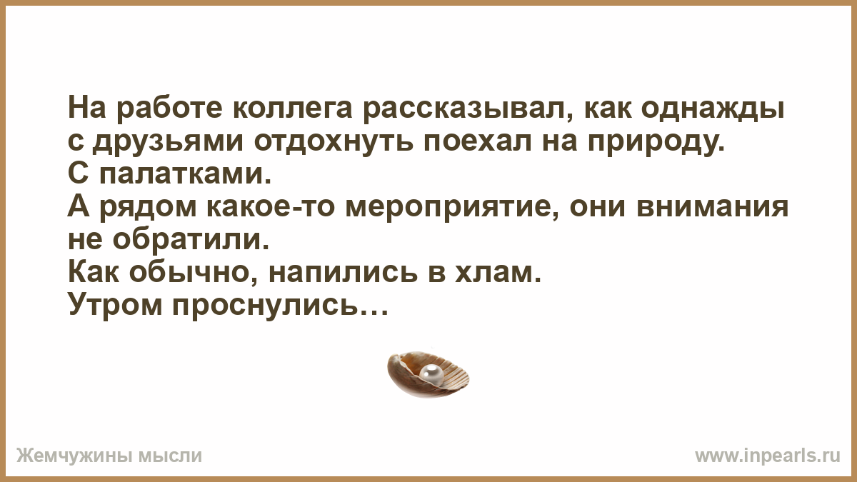 На работе коллега рассказывал, как однажды с друзьями отдохнуть поехал на природу. С палатками. А рядом какое-то мероприятие, они внимания не обратили. Как обычно, напились в хлам. Утром проснулись… А вокруг ходят люди в старинных одеждах. Мужчины, женщины, дети… И, в основном, по-французски разговаривают. Они с бодуна думали, что с ума сошли. Оказалось, попали на историческую реконструкцию Бородино. И ночью занесло их во французский лагерь. Больше не пьют.