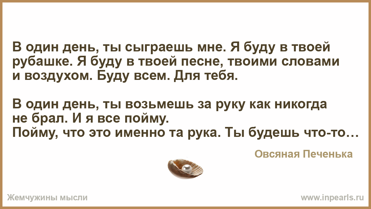 В один день, ты сыграешь мне. Я буду в твоей рубашке. Я буду в твоей песне, твоими словами и воздухом. Буду всем. Для тебя.