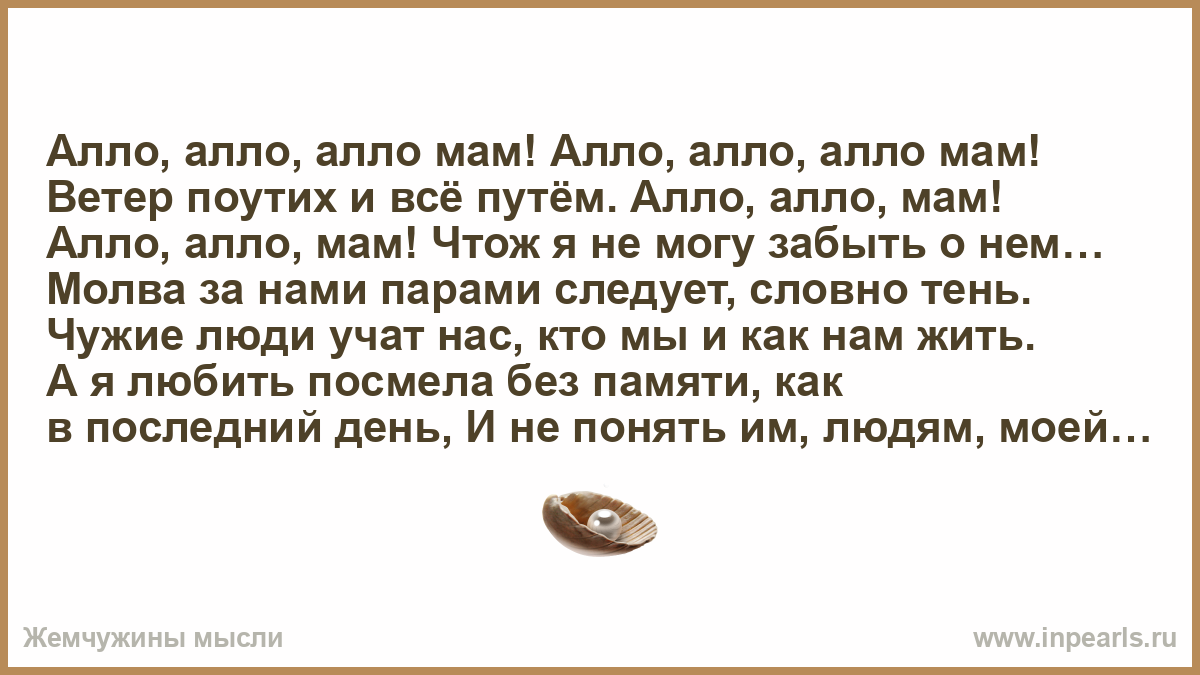 Алло, алло, алло мам! Алло, алло, алло мам! Ветер поутих и всё путём. Алло, алло, мам! Алло, алло, мам! Чтож я не могу забыть о нем… Молва за нами парами следует, словно тень. Чужие люди учат нас, кто мы и как нам жить. А я любить посмела без памяти, как в последний день, И не понять им, людям, моей души. Когда ушел он, думала, мне без него не жить, И мои слезы льдинками падали сверху вниз. И не совет мне нужен был, мама, а твоё «Держись».Прости, что поздно, больше мне некому позвонить!