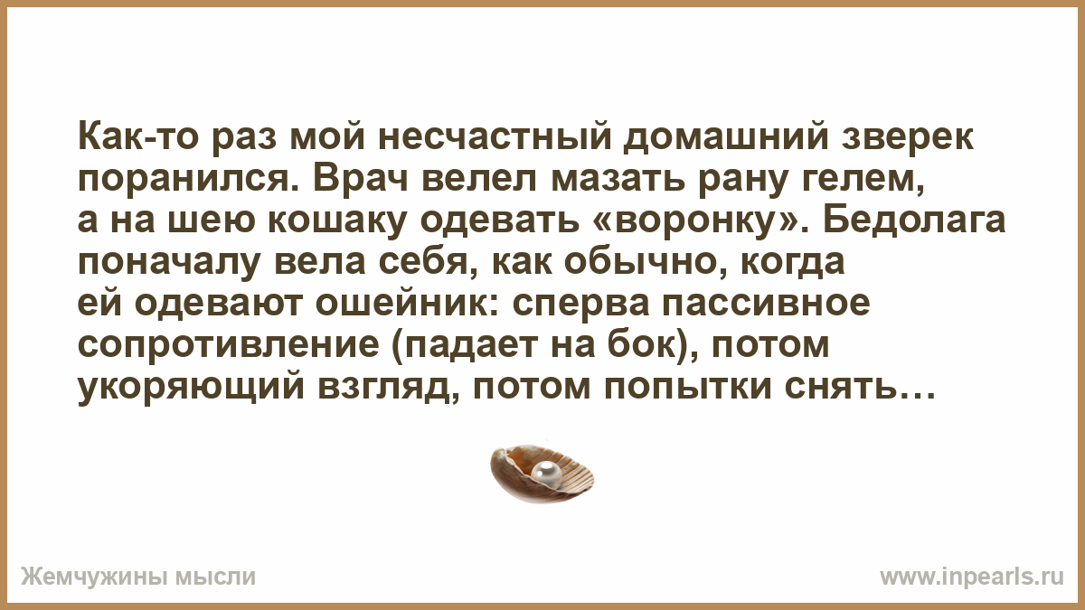 Как-то раз мой несчастный домашний зверек поранился. Врач велел мазать рану гелем, а на шею кошаку одевать «воронку». Бедолага поначалу вела себя, как обычно, когда ей одевают ошейник: сперва пассивное сопротивление (падает на бок), потом укоряющий взгляд, потом попытки снять самостоятельно. Попытки пресекались, так что кошуня сидела грустная в своей «воронке» и вздыхала. Еще она любила демонстрировать нам, как ей неудобно и какие мы злодеи — показывала, как ей трудно ходить, строила плаксивую мордочку, натыкалась на косяки. Наткнется и стоит, и смотрит укоризненно. Потом поняла, что мы не перестанем ее мучить, и наловчилась передвигаться в воротнике. Смешнее всего было наблюдать, как она ест в этом воротнике: наклонив голову вниз, она полностью накрывает воротником миску и хрустит кормом в этом «головоубежище»))