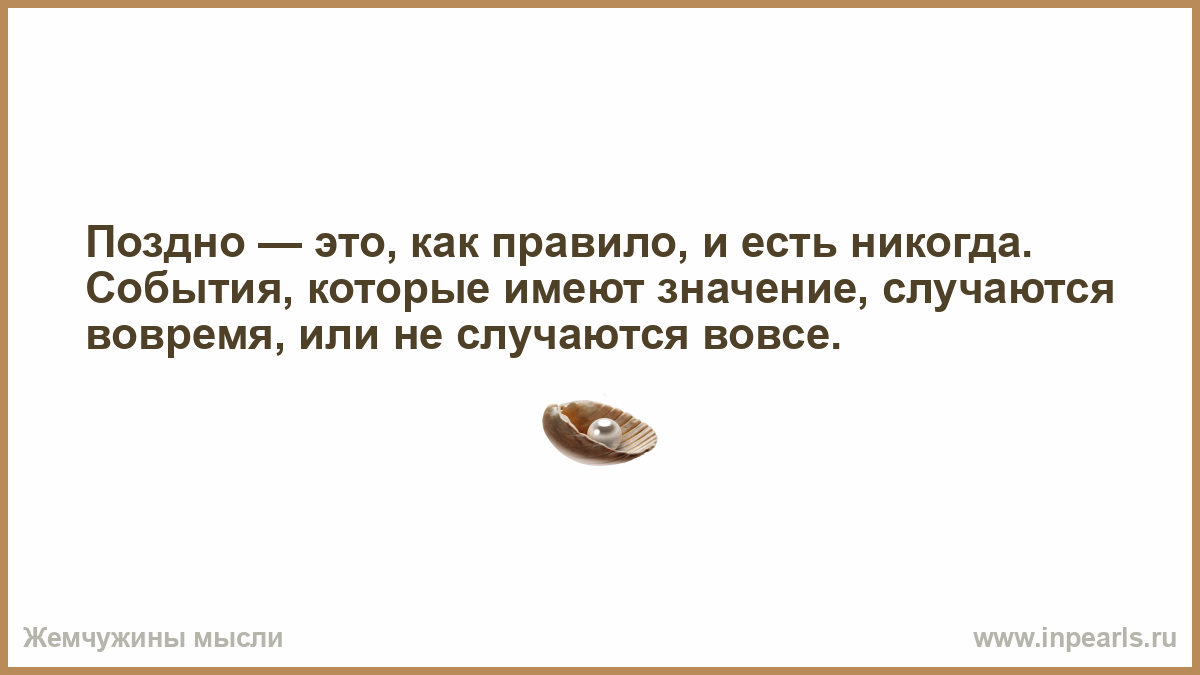 Поздно — это, как правило, и есть никогда. События, которые имеют значение, случаются вовремя, или не случаются вовсе.