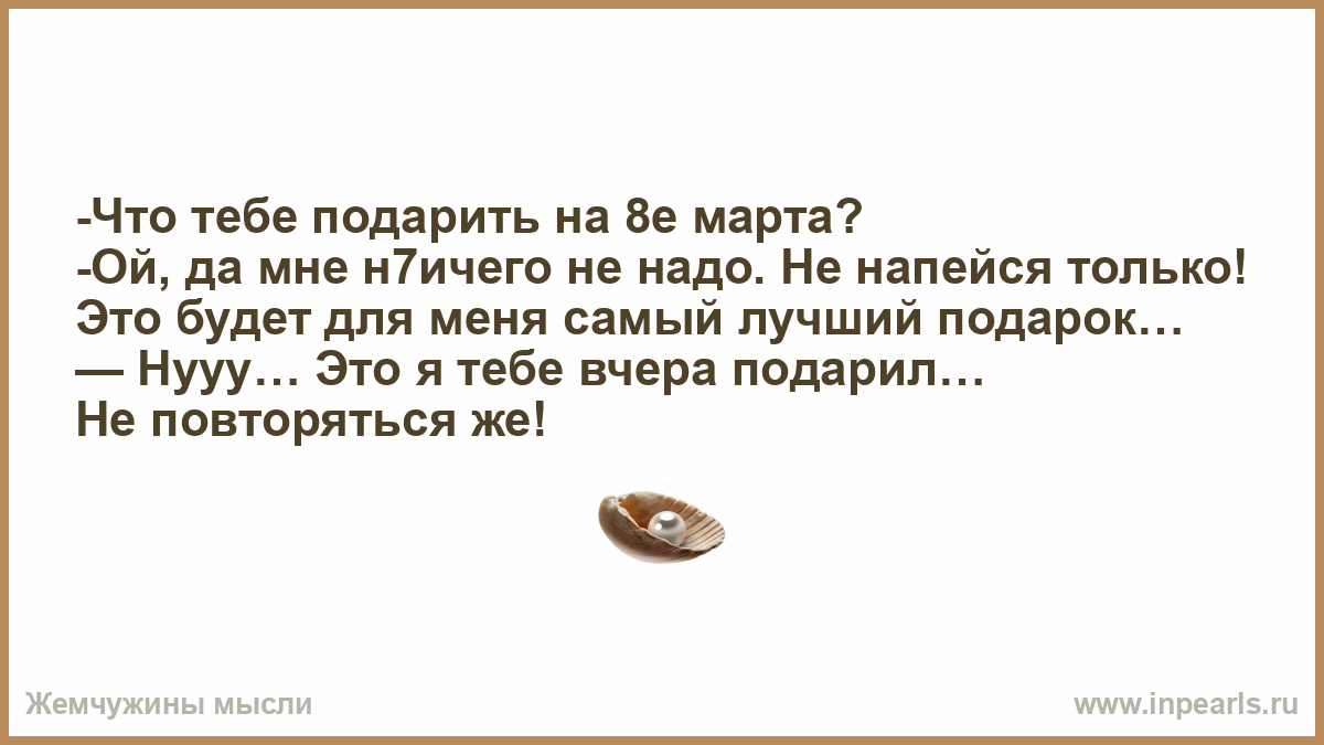 -Что тебе подарить на 8е марта? -Ой, да мне н7ичего не надо. Не напейся только! Это будет для меня самый лучший подарок… — Нууу… Это я тебе вчера подарил… Не повторяться же!