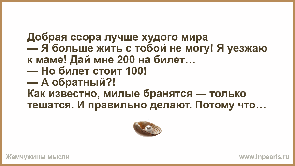 Как известно, милые бранятся — только тешатся. И правильно делают. Потому что отсутствие ссор и конфликтов вовсе не является гарантией совместного счастья, скорее, наоборот. Большая часть разводов приходится на те пары, которые не решают конфликтные ситуации, а замалчивают их. Обиды и недоразумения накапливаются и выливаются в стойкую неприязнь друг к другу. Кроме того, у терпеливых молчунов чаще развивается стресс, потому что им не помогает гормон кортизол, который вырабатывается в момент жарких споров и успешно этот стресс блокирует.