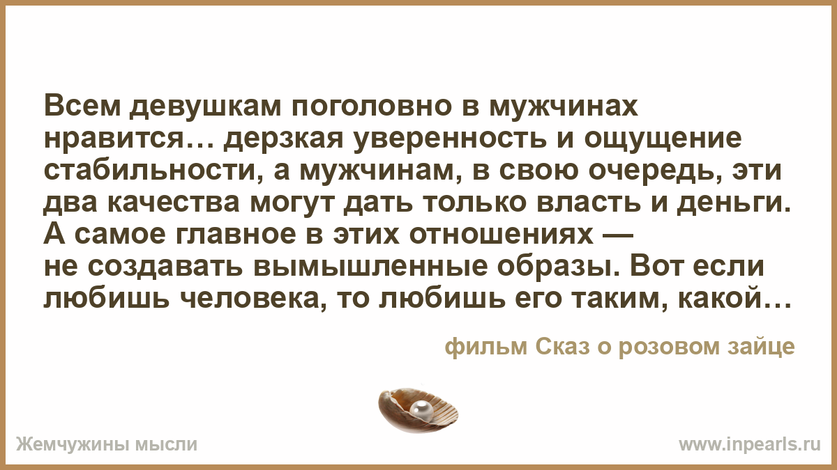 Всем девушкам поголовно в мужчинах нравится… дерзкая уверенность и ощущение стабильности, а мужчинам, в свою очередь, эти два качества могут дать только власть и деньги. А самое главное в этих отношениях — не создавать вымышленные образы. Вот если любишь человека, то любишь его таким, какой он есть, тогда любовь будет настоящей…