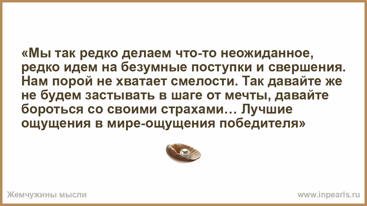 «Мы так редко делаем что-то неожиданное, редко идем на безумные поступки и свершения. Нам порой не хватает смелости. Так давайте же не будем застывать в шаге от мечты, давайте бороться со своими страхами… Лучшие ощущения в мире-ощущения победителя»