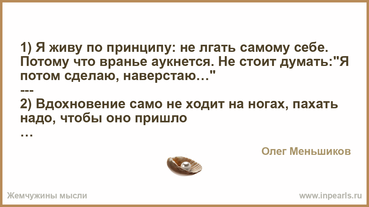 1) Я живу по принципу: не лгать самому себе. Потому что вранье аукнется. Не стоит думать:"Я потом сделаю, наверстаю…"