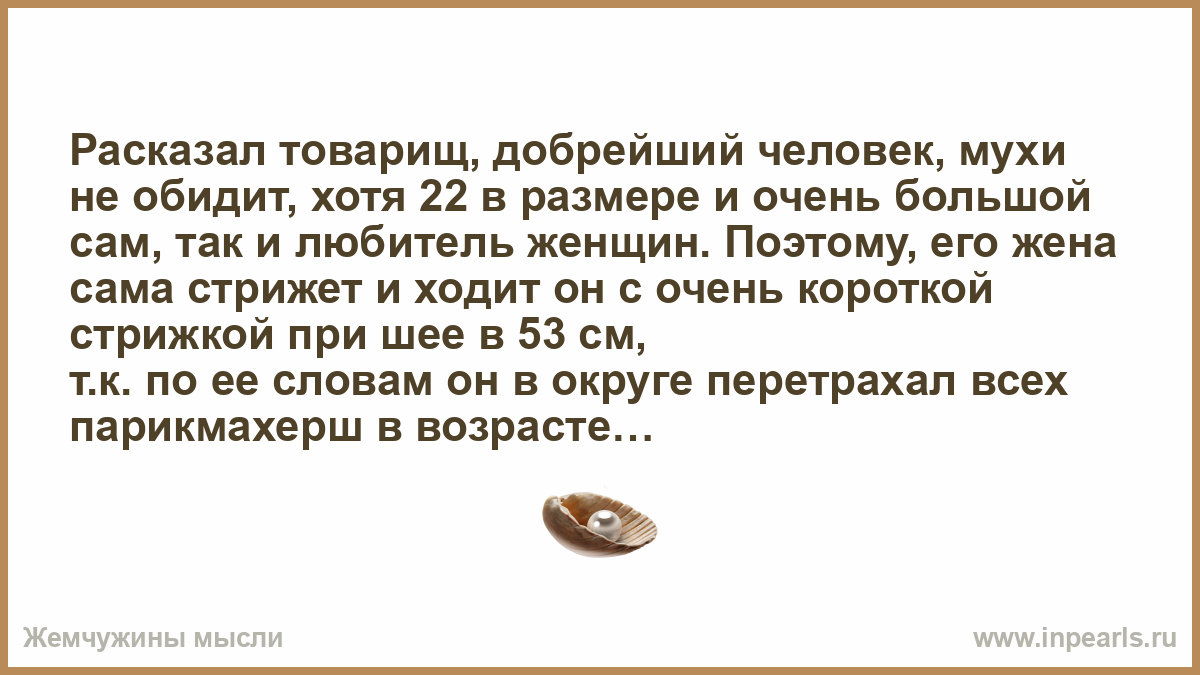 Расказал товарищ, добрейший человек, мухи не обидит, хотя 2×2 в размере и очень большой сам, так и любитель женщин. Поэтому, его жена