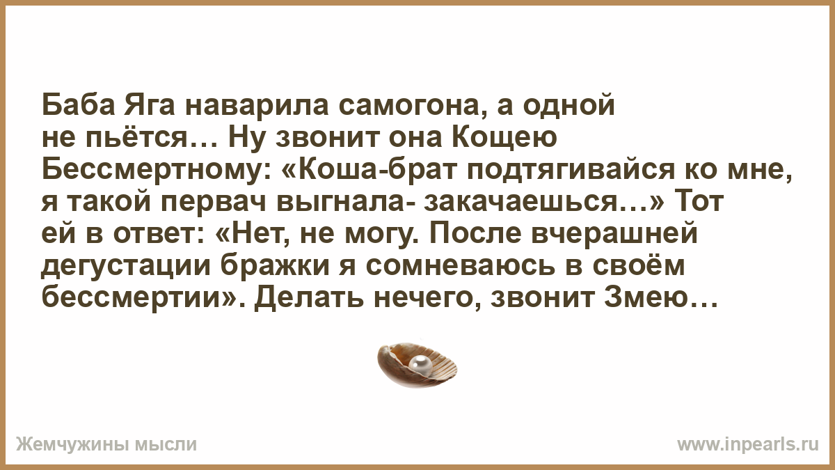 Баба Яга наварила самогона, а одной не пьётся… Ну звонит она Кощею Бессмертному: «Коша-брат подтягивайся ко мне, я такой первач выгнала- закачаешься…» Тот ей в ответ: «Нет, не могу. После вчерашней дегустации бражки я сомневаюсь в своём бессмертии». Делать нечего, звонит Змею Горынычу: «Змий! Братан! Давай ко мне, У меня такой классный первач… Похмелимся…» Змей в ответ: «не… После вчерашнего у меня одна голова до сих пор без сознания, вторая всю ночь блевала… До сих пор над унитазом висит… Как я третьей разговариваю — сам не понимаю… Извини…» Ну знать не судьба… Подумала Яга и позвонила Лешему: «Лешик! Дружище!!! Приходи… У меня первач…» «БЕГУ» Ну Яга на радостях на стол сгоношила… Запотевшую литруху первача с морозилочки достала… Сидит лешего ждёт… Час, второй, третий… Дважды бутылочку охлаждала… У окна сидит-ждёт… Вдруг из леса на всех парах выбегает леший. Пробежал 5 метров и упал замертво. Яга перепугалась… А он через мгновение подпрыгнул и бежать… через 5−10 метров опять замертво… Потом опять резко бежать… И так ещё с пол-часа до избушки Яги… Та дверь открыла, а Леший замертво на порог рухнул. Ну она сначала Живой Водичкой окропила его, а потом стакан первача ему всучила… Леший залпом стаканюгу уговорил и молча в окно уставился… Яга и спрашивает его: «Лешик! А чё-ет ты так странно бежал???» Тот отвечает: «Ну мы вчера и упились… Похмелиться надо было — ноги сами несли… как вспомню, что тебя после этого ебать надо- сознание теряю»