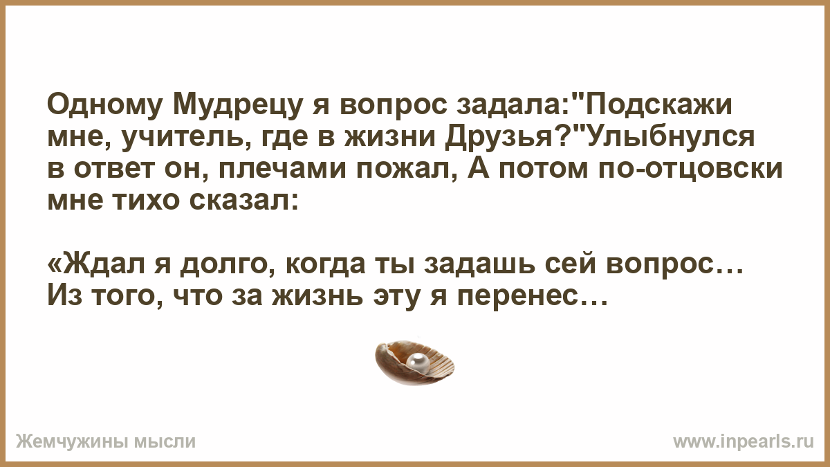 Одному Мудрецу я вопрос задала:"Подскажи мне, учитель, где в жизни Друзья?"Улыбнулся в ответ он, плечами пожал, А потом по-отцовски мне тихо сказал: