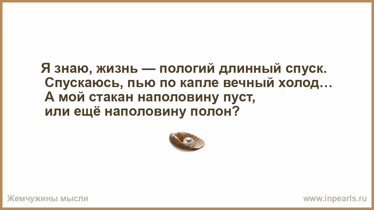 Я знаю, жизнь — пологий длинный спуск. Спускаюсь, пью по капле вечный холод… А мой стакан наполовину пуст, или ещё наполовину полон?