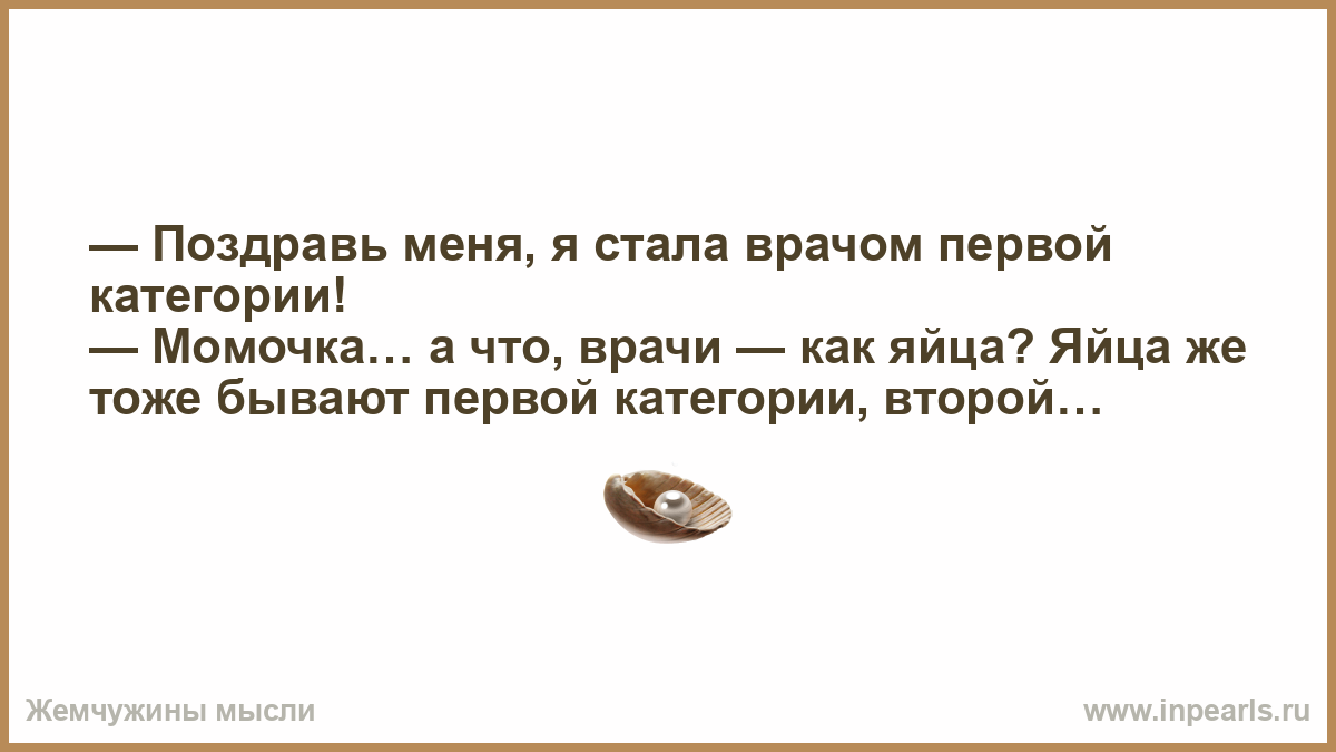 — Поздравь меня, я стала врачом первой категории! — Момочка… а что, врачи — как яйца? Яйца же тоже бывают первой категории, второй…