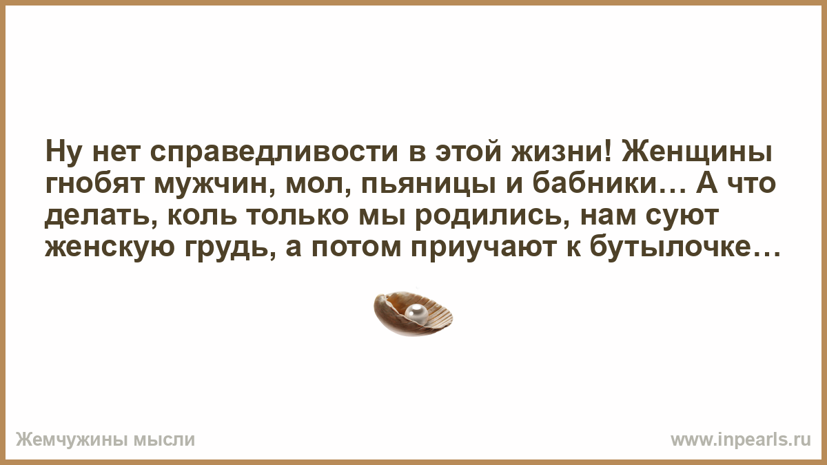 Ну нет справедливости в этой жизни! Женщины гнобят мужчин, мол, пьяницы и бабники… А что делать, коль только мы родились, нам суют женскую грудь, а потом приучают к бутылочке…