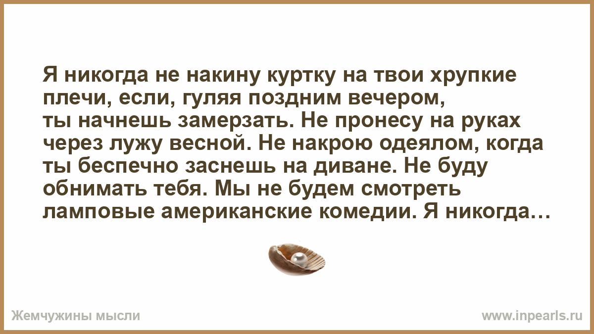 Я никогда не накину куртку на твои хрупкие плечи, если, гуляя поздним вечером, ты начнешь замерзать. Не пронесу на руках через лужу весной. Не накрою одеялом, когда ты беспечно заснешь на диване. Не буду обнимать тебя. Мы не будем смотреть ламповые американские комедии. Я никогда не похвалю твоего борща и не познакомлюсь с твоей мамой.