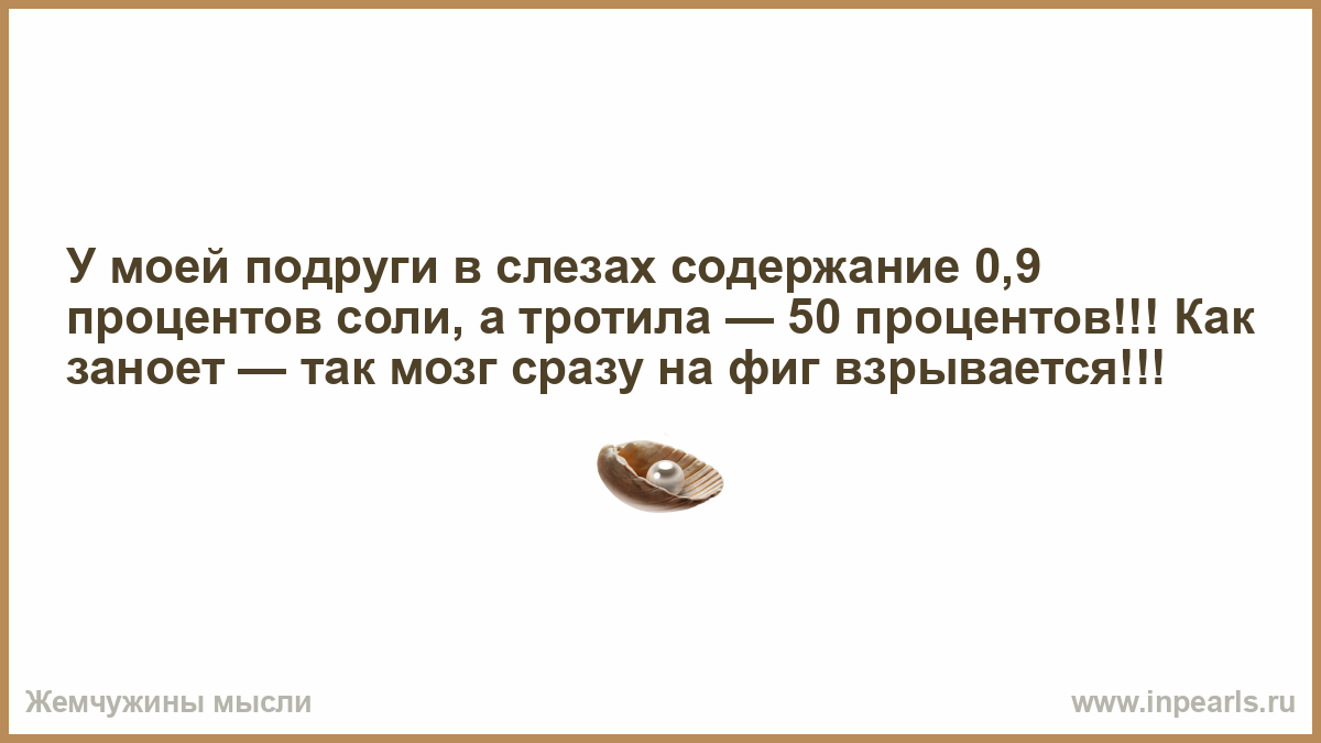 У моей подруги в слезах содержание 0,9 процентов соли, а тротила — 50 процентов!!! Как заноет — так мозг сразу на фиг взрывается!!!