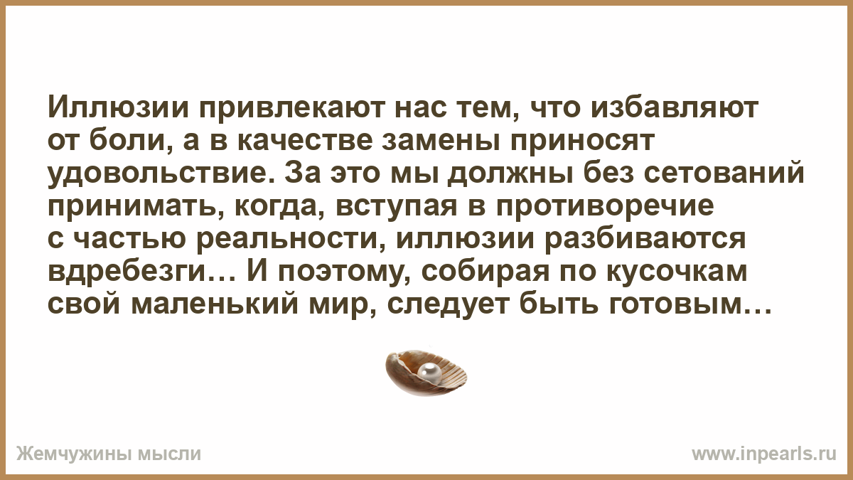 Иллюзии привлекают нас тем, что избавляют от боли, а в качестве замены приносят удовольствие. За это мы должны без сетований принимать, когда, вступая в противоречие с частью реальности, иллюзии разбиваются вдребезги… И поэтому, собирая по кусочкам свой маленький мир, следует быть готовым к тому, что кто-нибудь, пройдя мимо, случайно разобьет на мелкие части все, что ты собрал… И тогда ты услышишь реквием… Но не так, как обычно. Этот будет звучать громко и четко. Будет звучать рядом. Звучать для тебя. Реквием по твоей мечте…