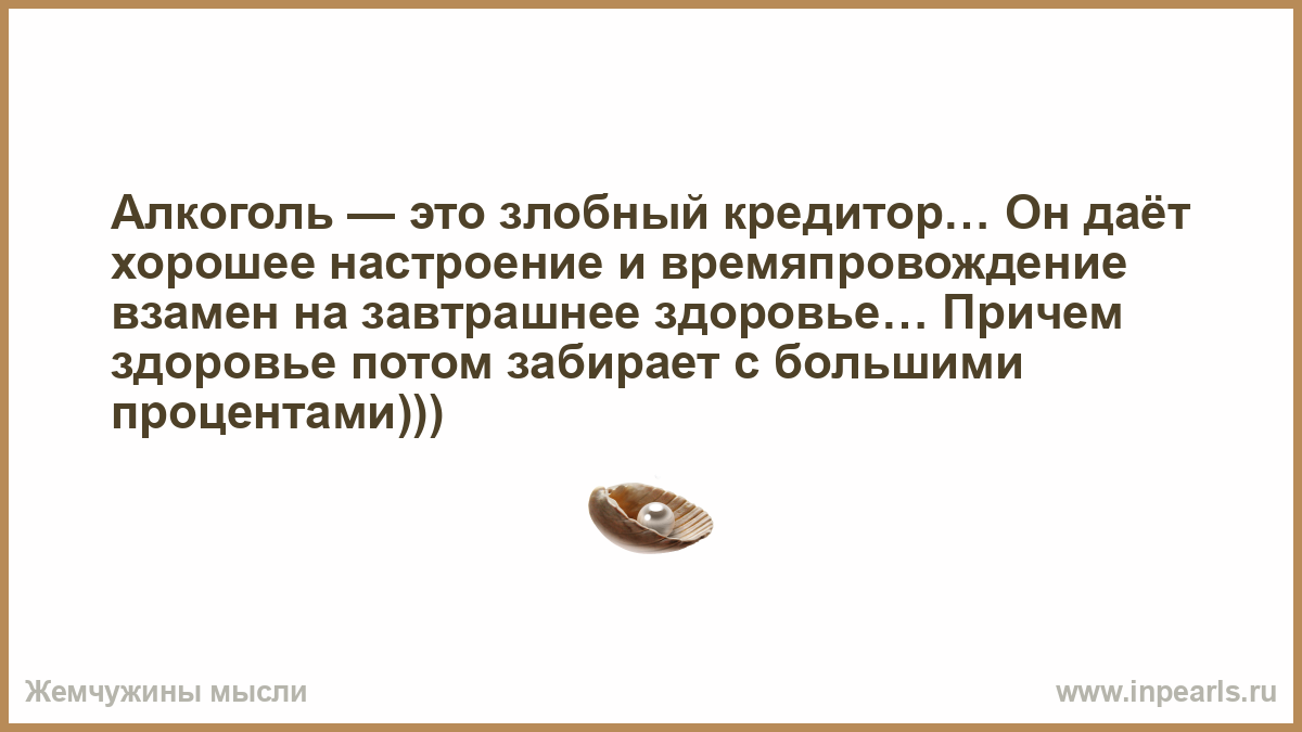 Алкоголь — это злобный кредитор… Он даёт хорошее настроение и времяпровождение взамен на завтрашнее здоровье… Причем здоровье потом забирает с большими процентами)))