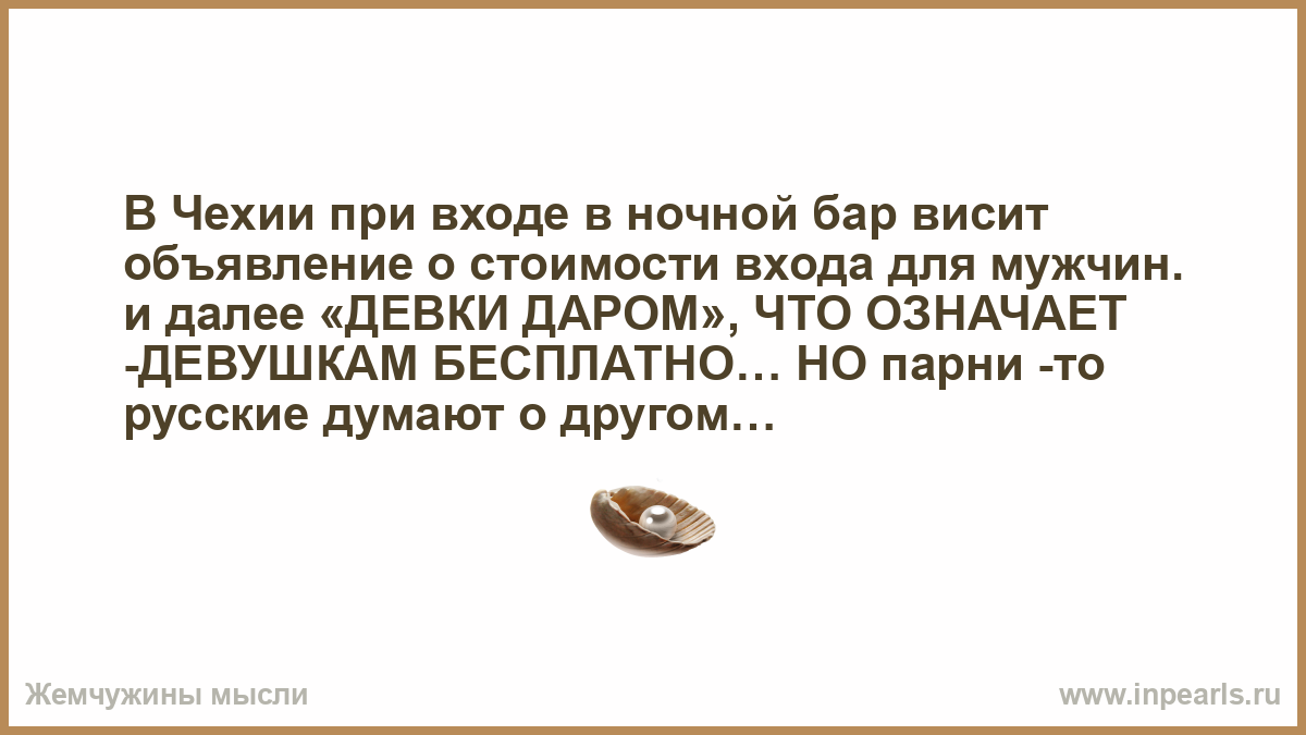 В Чехии при входе в ночной бар висит объявление о стоимости входа для мужчин. и далее «ДЕВКИ ДАРОМ», ЧТО ОЗНАЧАЕТ -ДЕВУШКАМ БЕСПЛАТНО… НО парни -то русские думают о другом…