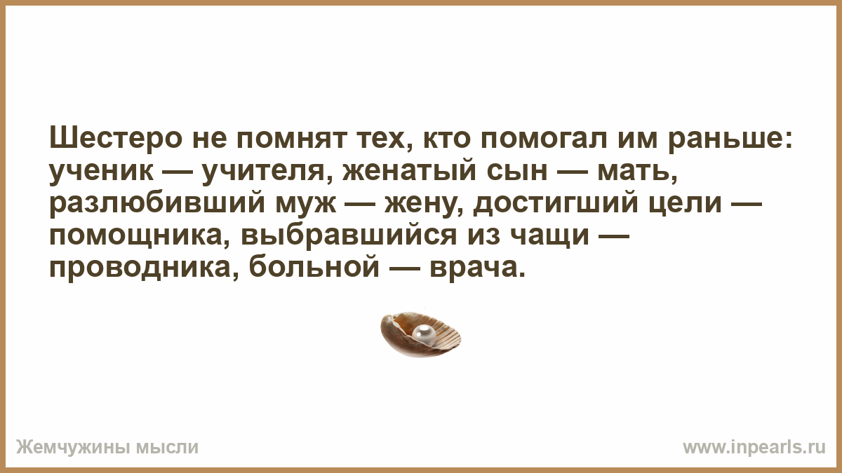 Шестеро не помнят тех, кто помогал им раньше: ученик — учителя, женатый сын — мать, разлюбивший муж — жену, достигший цели — помощника, выбравшийся из чащи — проводника, больной — врача.