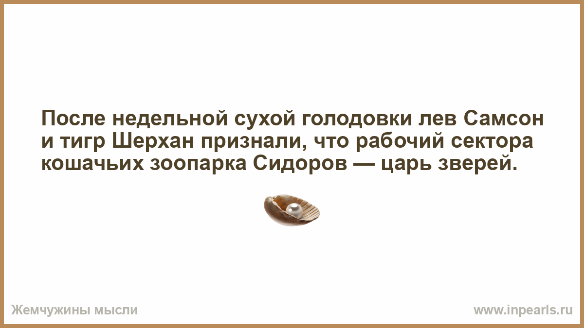 После недельной сухой голодовки лев Самсон и тигр Шерхан признали, что рабочий сектора кошачьих зоопарка Сидоров — царь зверей.