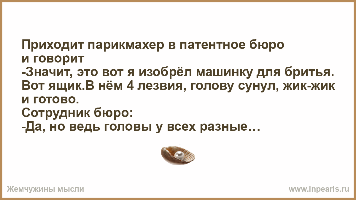 Приходит парикмахер в патентное бюро и говорит -Значит, это вот я изобрёл машинку для бритья. Вот ящик.В нём 4 лезвия, голову сунул, жик-жик и готово. Сотрудник бюро: -Да, но ведь головы у всех разные. -Первый раз- да…