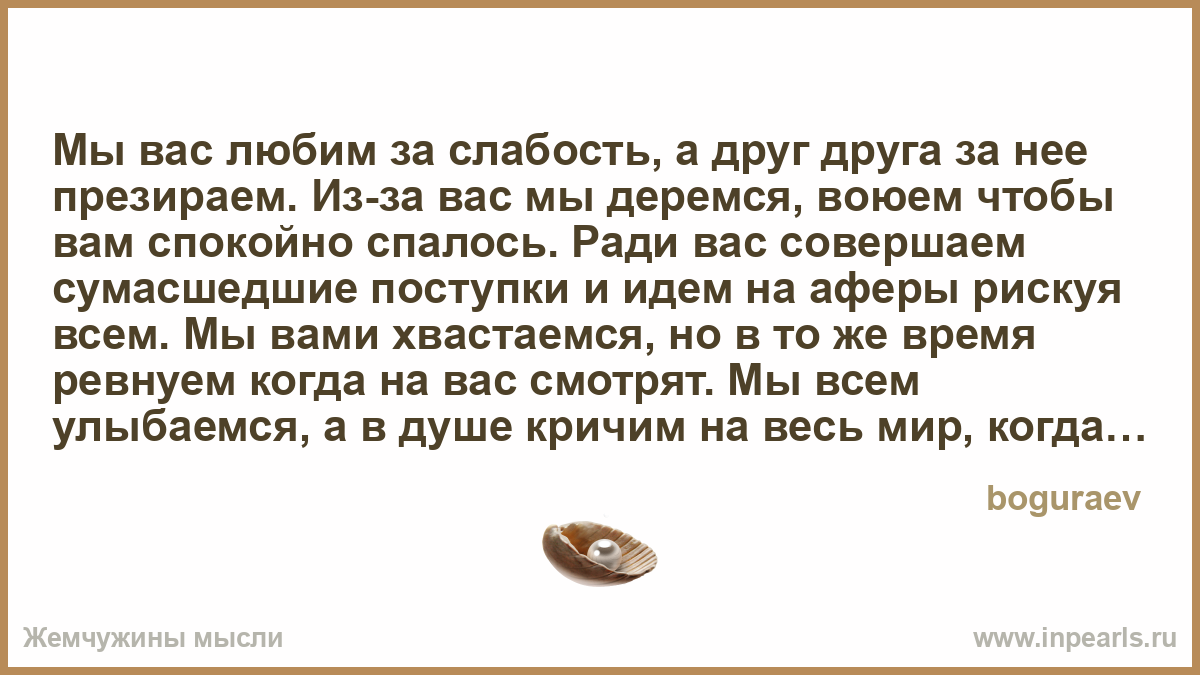 Мы вас любим за слабость, а друг друга за нее презираем. Из-за вас мы деремся, воюем чтобы вам спокойно спалось. Ради вас совершаем сумасшедшие поступки и идем на аферы рискуя всем. Мы вами хвастаемся, но в то же время ревнуем когда на вас смотрят. Мы всем улыбаемся, а в душе кричим на весь мир, когда вас теряем. И хоть и делаем вид что не любим 8 марта, но с удовольствием дарим вам подарки и пьем в этот день только за вас, из-за вас и ради вас… как впрочем и всегда ;)
