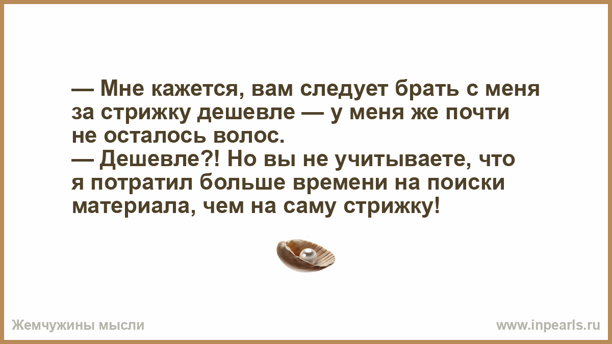 — Мне кажется, вам следует брать с меня за стрижку дешевле — у меня же почти не осталось волос. — Дешевле?! Но вы не учитываете, что я потратил больше времени на поиски материала, чем на саму стрижку!