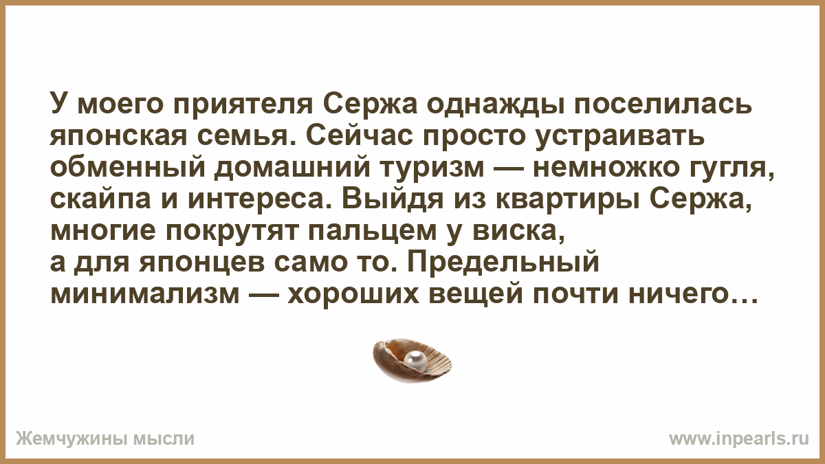 У моего приятеля Сержа однажды поселилась японская семья. Сейчас просто устраивать обменный домашний туризм — немножко гугля, скайпа и интереса. Выйдя из квартиры Сержа, многие покрутят пальцем у виска,