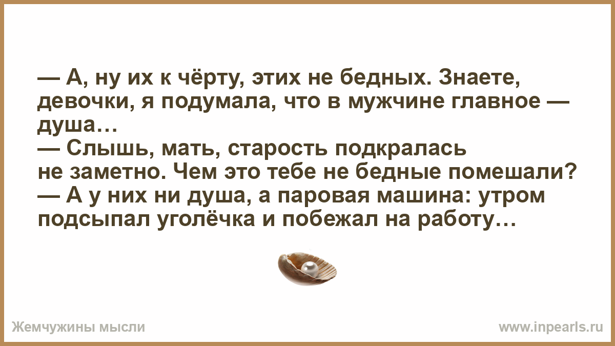 — А, ну их к чёрту, этих не бедных. Знаете, девочки, я подумала, что в мужчине главное — душа…