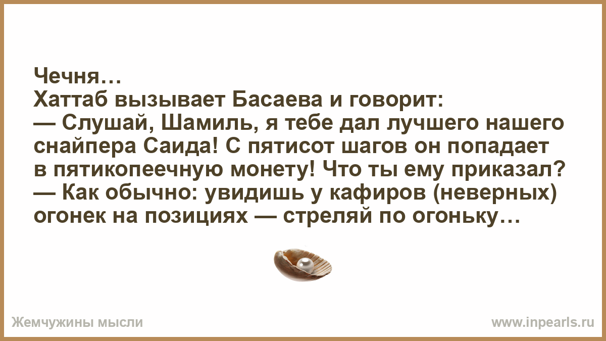 — Слушай, Шамиль, я тебе дал лучшего нашего снайпера Саида! С пятисот шагов он попадает в пятикопеечную монету! Что ты ему приказал?