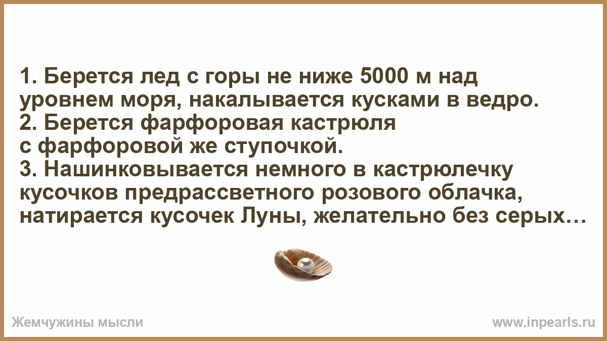 3. Нашинковывается немного в кастрюлечку кусочков предрассветного розового облачка, натирается кусочек Луны, желательно без серых пятнышек, капля масла из ландышей и заливается молоком дикой верблюдицы.