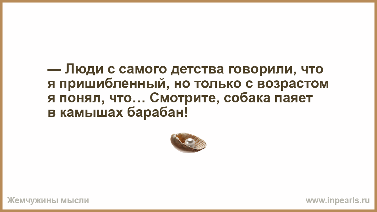 — Люди с самого детства говорили, что я пришибленный, но только с возрастом я понял, что… Смотрите, собака паяет в камышах барабан!