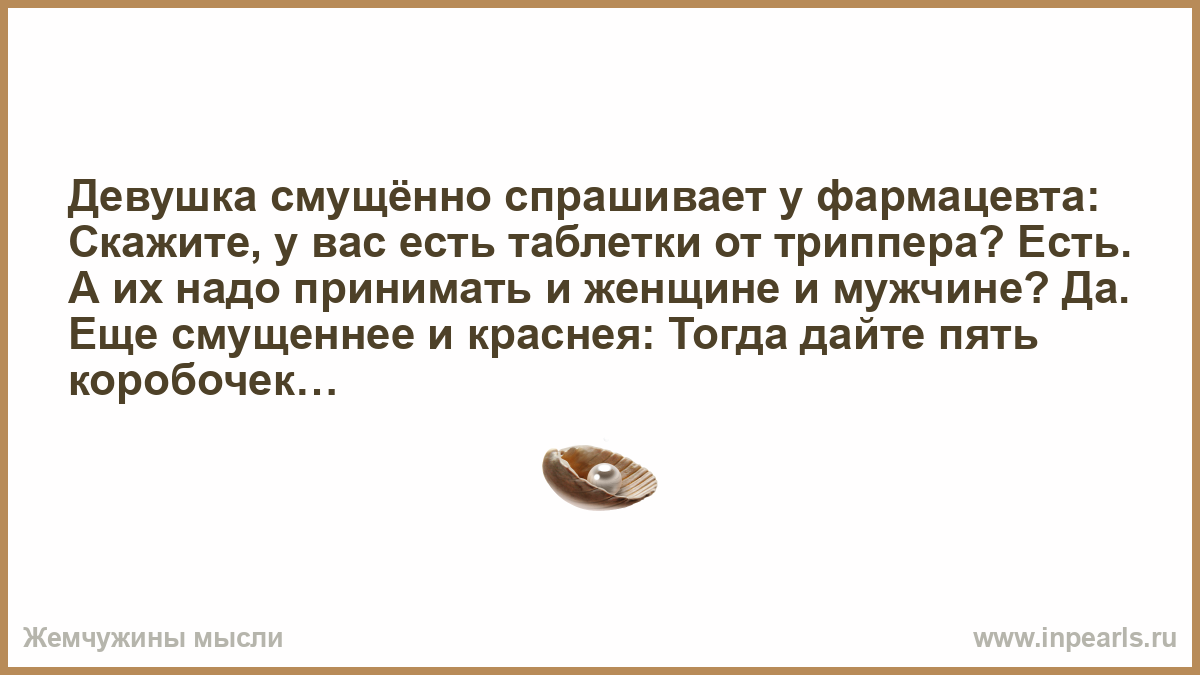 Девушка смущённо спрашивает у фармацевта: Скажите, у вас есть таблетки от триппера? Есть. А их надо принимать и женщине и мужчине? Да. Еще смущеннее и краснея: Тогда дайте пять коробочек…