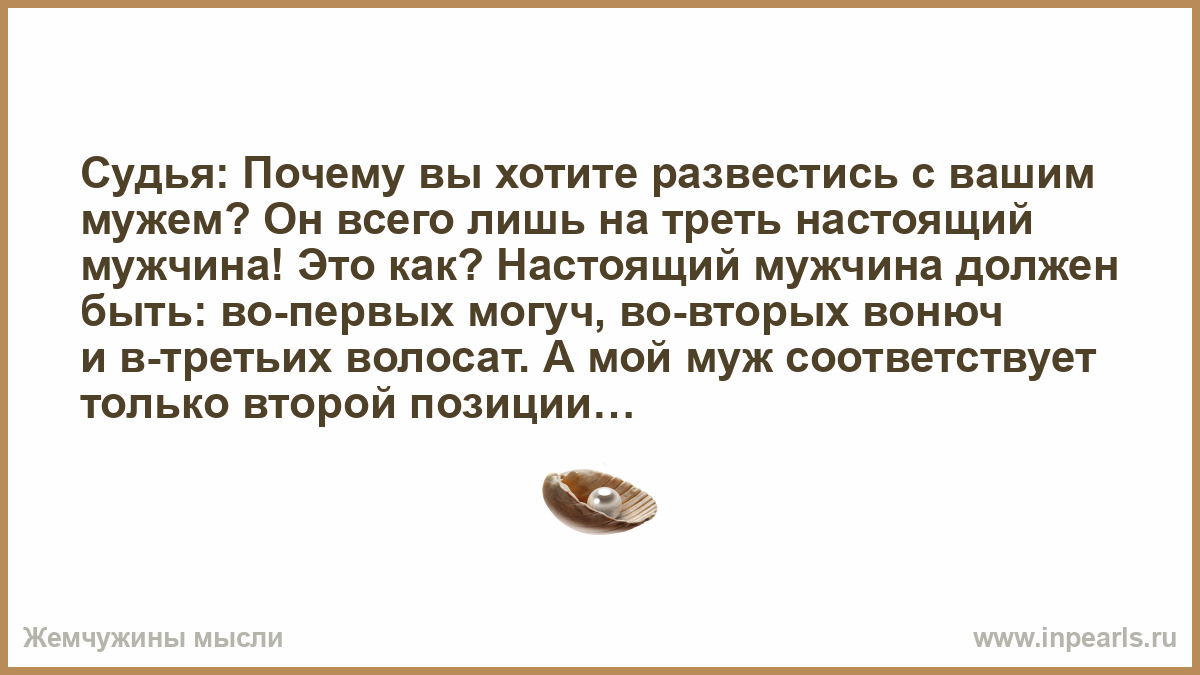 Судья: Почему вы хотите развестись с вашим мужем? Он всего лишь на треть настоящий мужчина! Это как? Настоящий мужчина должен быть: во-первых могуч, во-вторых вонюч и в-третьих волосат. А мой муж соответствует только второй позиции…