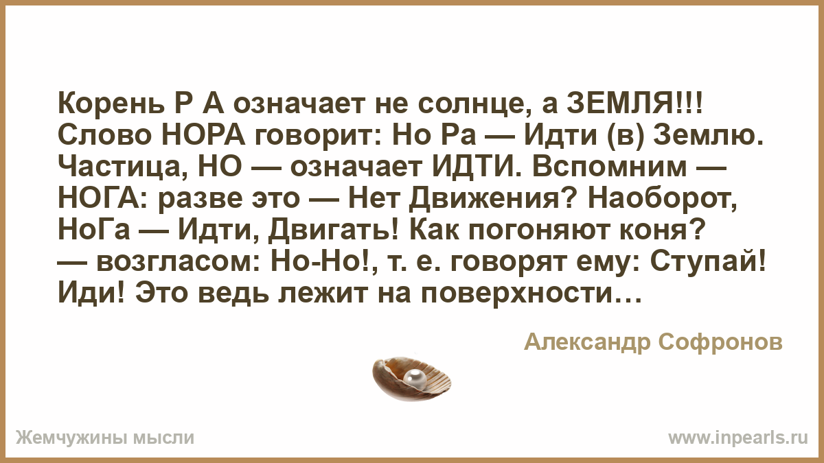 Слово НОРА говорит: Но Ра — Идти (в) Землю. Частица, НО — означает ИДТИ. Вспомним — НОГА: разве это — Нет Движения? Наоборот, НоГа — Идти, Двигать! Как погоняют коня? — возгласом: Но-Но!, т. е. говорят ему: Ступай! Иди! Это ведь лежит на поверхности! В дополнение посмотрим на слово НОЧЬ — Идет Ч — чернота.