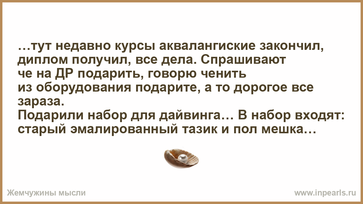 …тут недавно курсы аквалангиские закончил, диплом получил, все дела. Спрашивают че на ДР подарить, говорю ченить из оборудования подарите, а то дорогое все зараза. Подарили набор для дайвинга… В набор входят: старый эмалированный тазик и пол мешка цемента. Уроды блин…