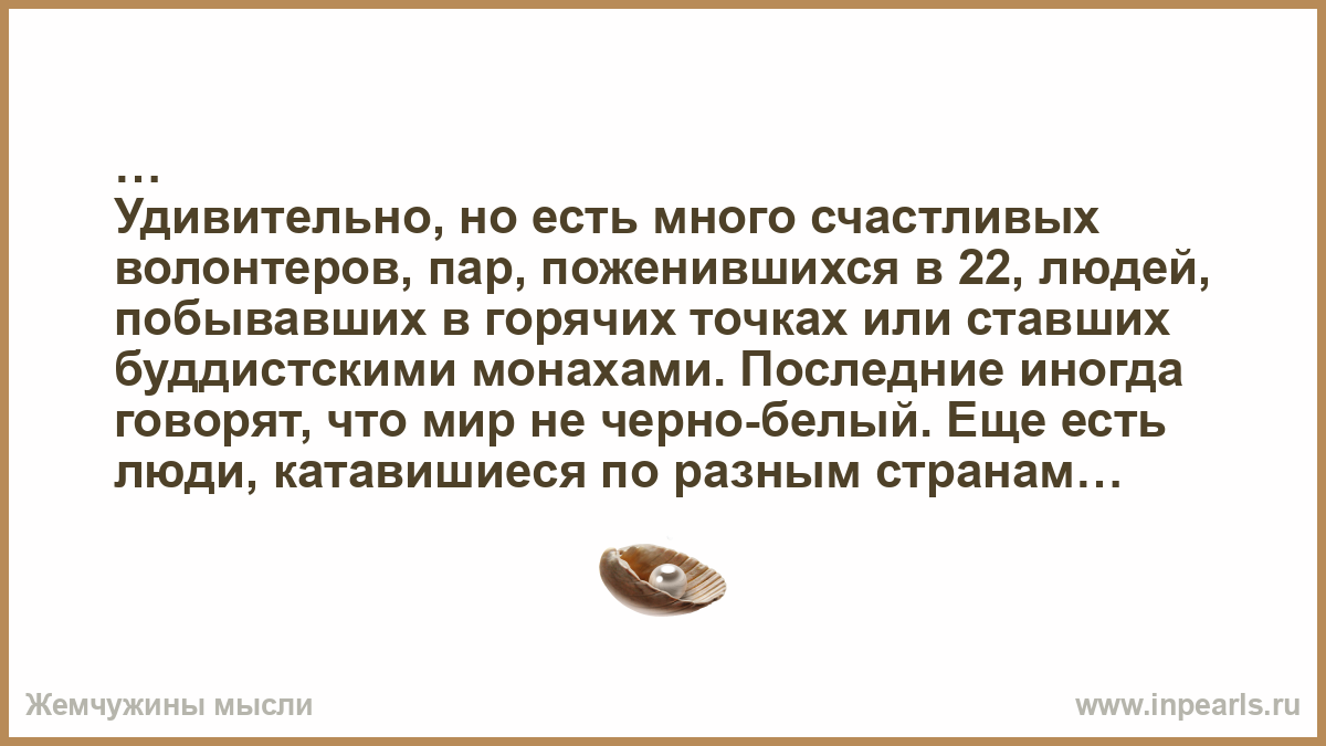 Удивительно, но есть много счастливых волонтеров, пар, поженившихся в 22, людей, побывавших в горячих точках или ставших буддистскими монахами. Последние иногда говорят, что мир не черно-белый. Еще есть люди, катавишиеся по разным странам и жившие, скажем, в Индии, а потом построившие карьеру, осознанно выбрав такой путь. Многие европейцы едут после университетов. А Израиле, например, после армии уезжают на год или полтора в Южную Америку, Азию или на Гоа. А потом строят карьеру менеджеров в курпных компаниях. Есть люди, оставшиеся в этих странных местах и построившие свою жизнь там. А еще есть люди, которые всю жизнь мечтали жить на острове и работали для этого на износ, и так и не поехавшие туда :)))