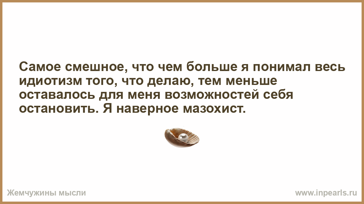 Самое смешное, что чем больше я понимал весь идиотизм того, что делаю, тем меньше оставалось для меня возможностей себя остановить. Я наверное мазохист.