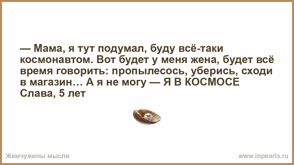 — Мама, я тут подумал, буду всё-таки космонавтом. Вот будет у меня жена, будет всё время говорить: пропылесось, уберись, сходи в магазин… А я не могу — Я В КОСМОСЕ