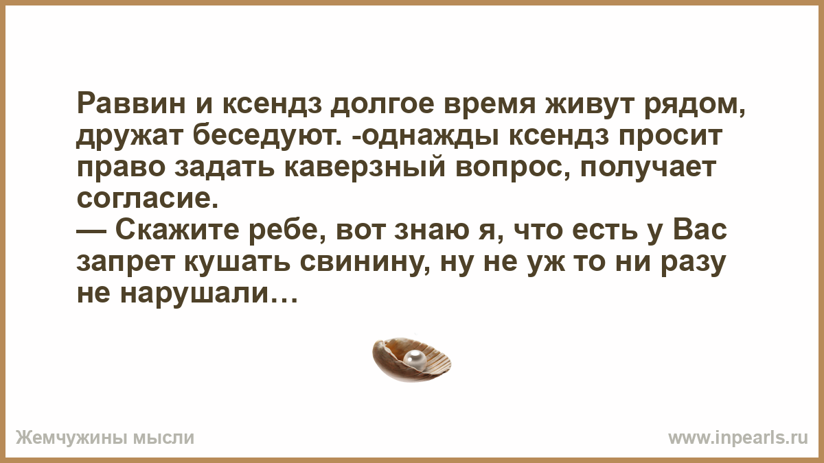 — Знаете, отвечает раввин, был в молодости случай, 20-е годы, голод, попробовал я ветчинки! … А у меня встречный вопрос: Вот есть у Вас обет безбрачия, неужели так и ни разу не попробовали?