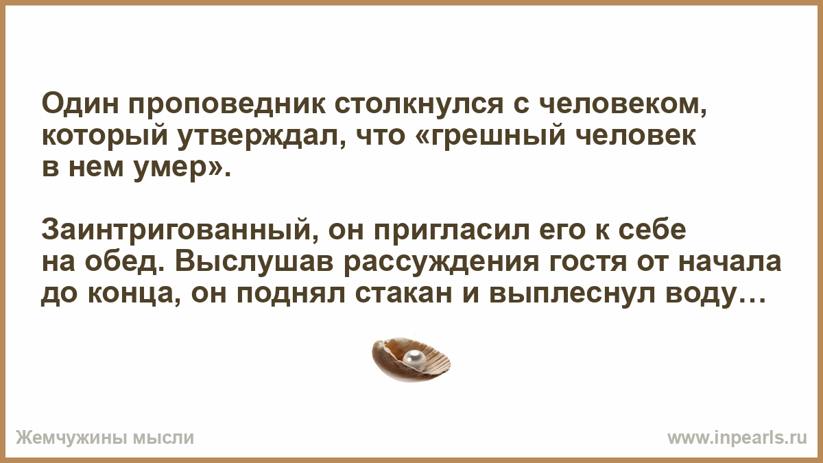 На что проповедник ответил: «О, как видите, прежний человек в вас вовсе не умер. Он просто был в обмороке и пришел в себя от стакана воды».