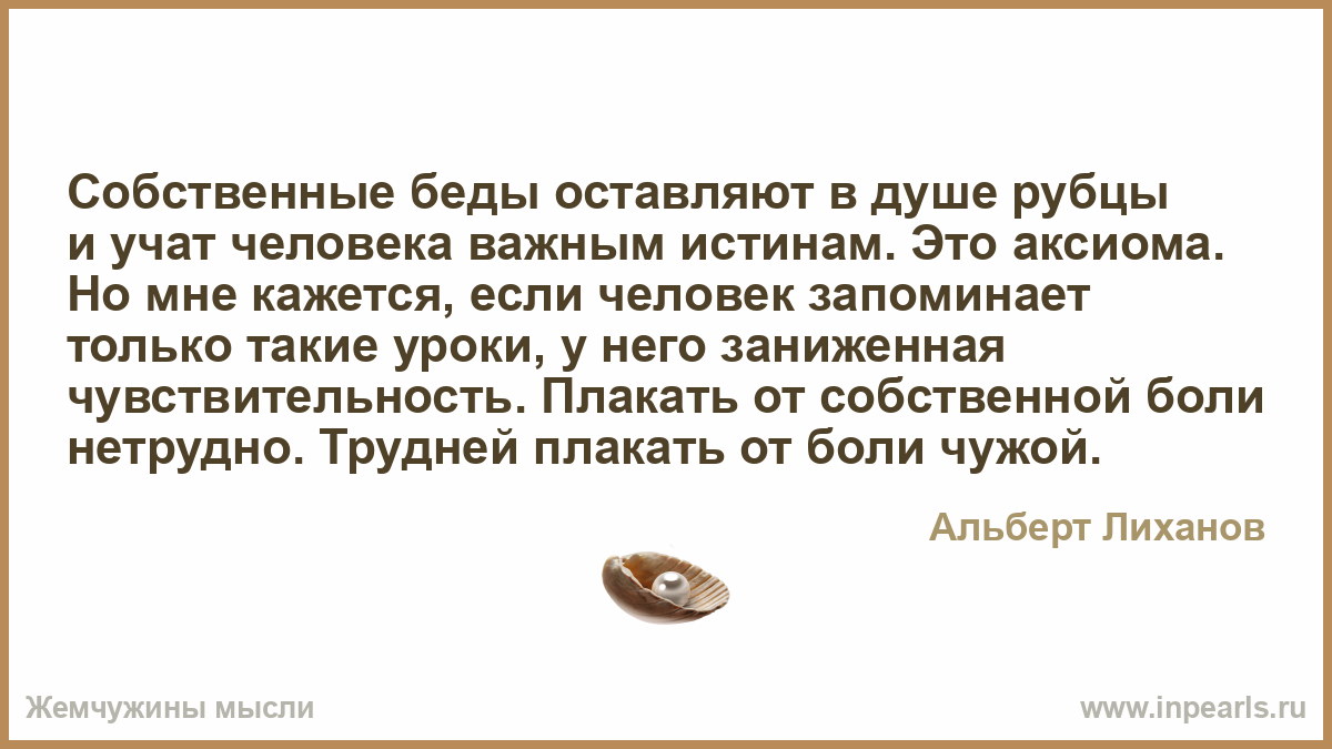 Собственные беды оставляют в душе рубцы и учат человека важным истинам. Это аксиома. Но мне кажется, если человек запоминает только такие уроки, у него заниженная чувствительность. Плакать от собственной боли нетрудно. Трудней плакать от боли чужой.