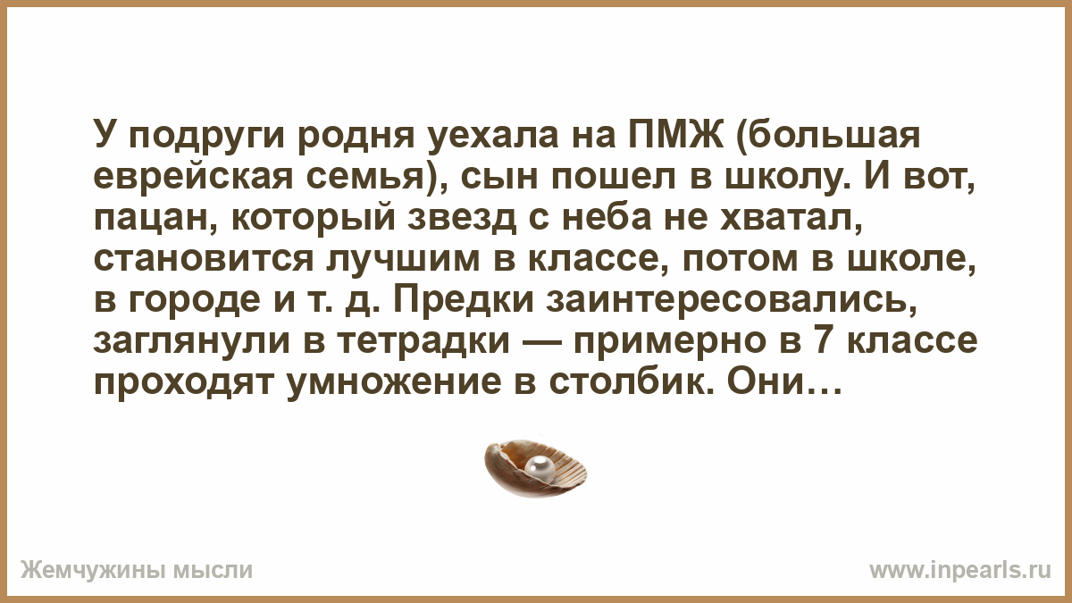 У подруги родня уехала на ПМЖ (большая еврейская семья), сын пошел в школу. И вот, пацан, который звезд с неба не хватал, становится лучшим в классе, потом в школе, в городе и т. д. Предки заинтересовались, заглянули в тетрадки — примерно в 7 классе проходят умножение в столбик. Они к преподам — как так, у нас это в первом пройдено. А им говорят:"Мы готовим персонал для баров и бензоколонок. Хотите нормальное образование — идите в частную школу." Они малого в самолет и к родне в Москву в нормальную школу. А теперь, судя по дочкиным рассказам, у нас школы хотят до того же уровня довести.