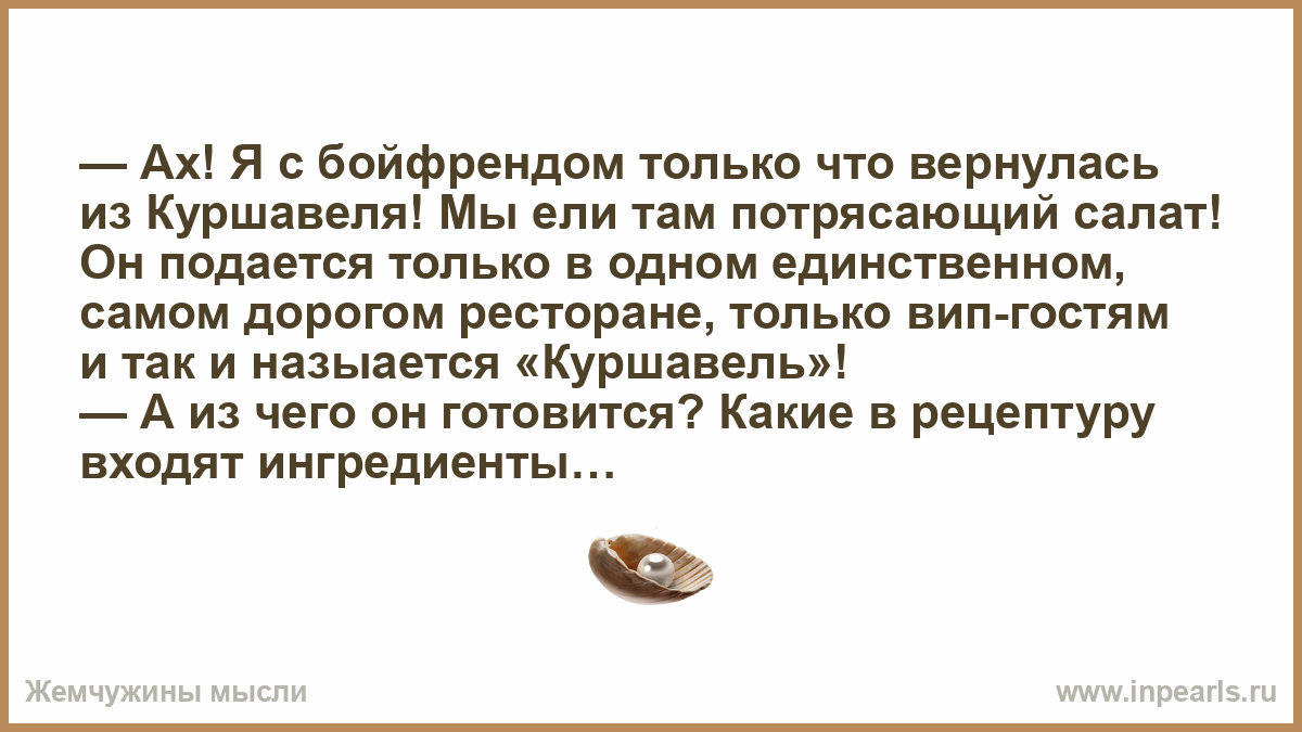 — Ах! Я с бойфрендом только что вернулась из Куршавеля! Мы ели там потрясающий салат! Он подается только в одном единственном, самом дорогом ресторане, только вип-гостям и так и назыается «Куршавель»! — А из чего он готовится? Какие в рецептуру входят ингредиенты? — Как какие? Курица и щавель…
