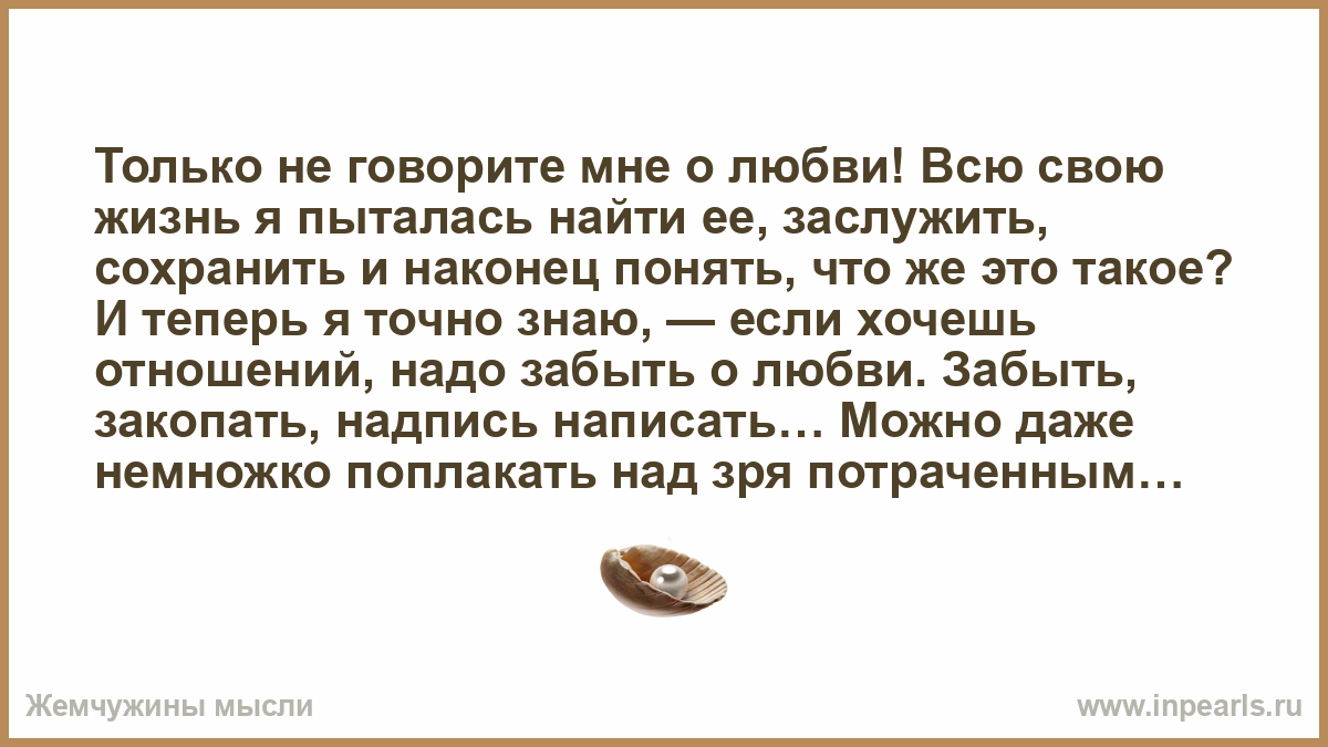Только не говорите мне о любви! Всю свою жизнь я пыталась найти ее, заслужить, сохранить и наконец понять, что же это такое? И теперь я точно знаю, — если хочешь отношений, надо забыть о любви. Забыть, закопать, надпись написать… Можно даже немножко поплакать над зря потраченным временем. А потом начинать таки работать не над любовью, а над отношениями и собственной способностью к близости.