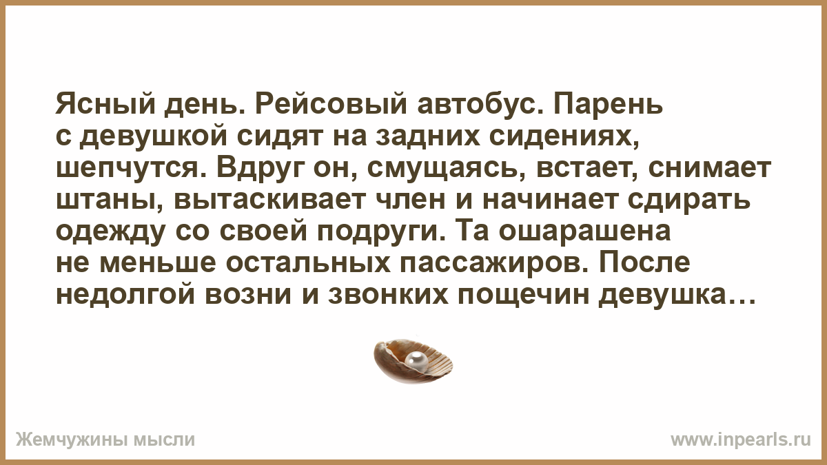 Ясный день. Рейсовый автобус. Парень с девушкой сидят на задних сидениях, шепчутся. Вдруг он, смущаясь, встает, снимает штаны, вытаскивает член и начинает сдирать одежду со своей подруги. Та ошарашена не меньше остальных пассажиров. После недолгой возни и звонких пощечин девушка выдает: «Я сказала прелюдия, а не при людях! »